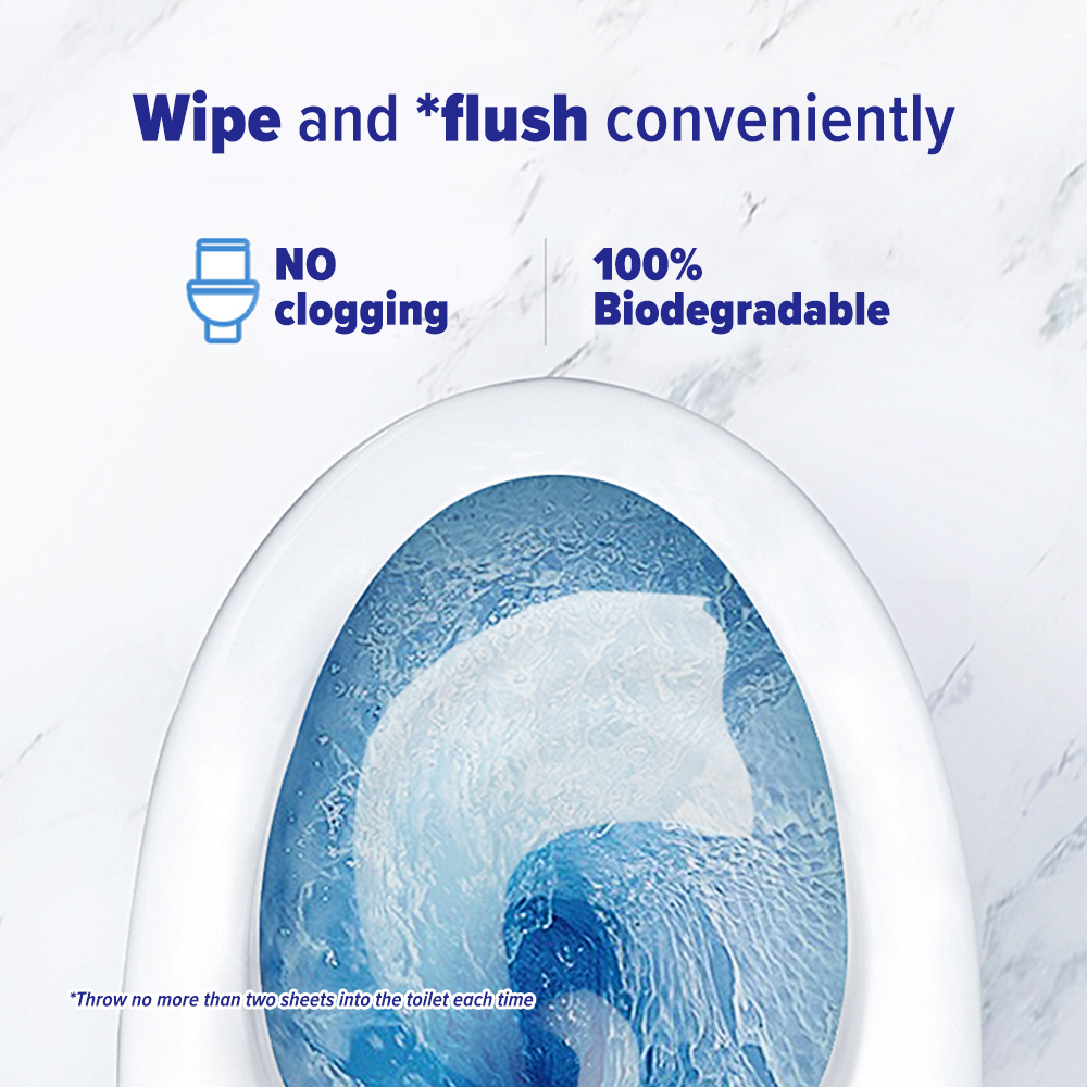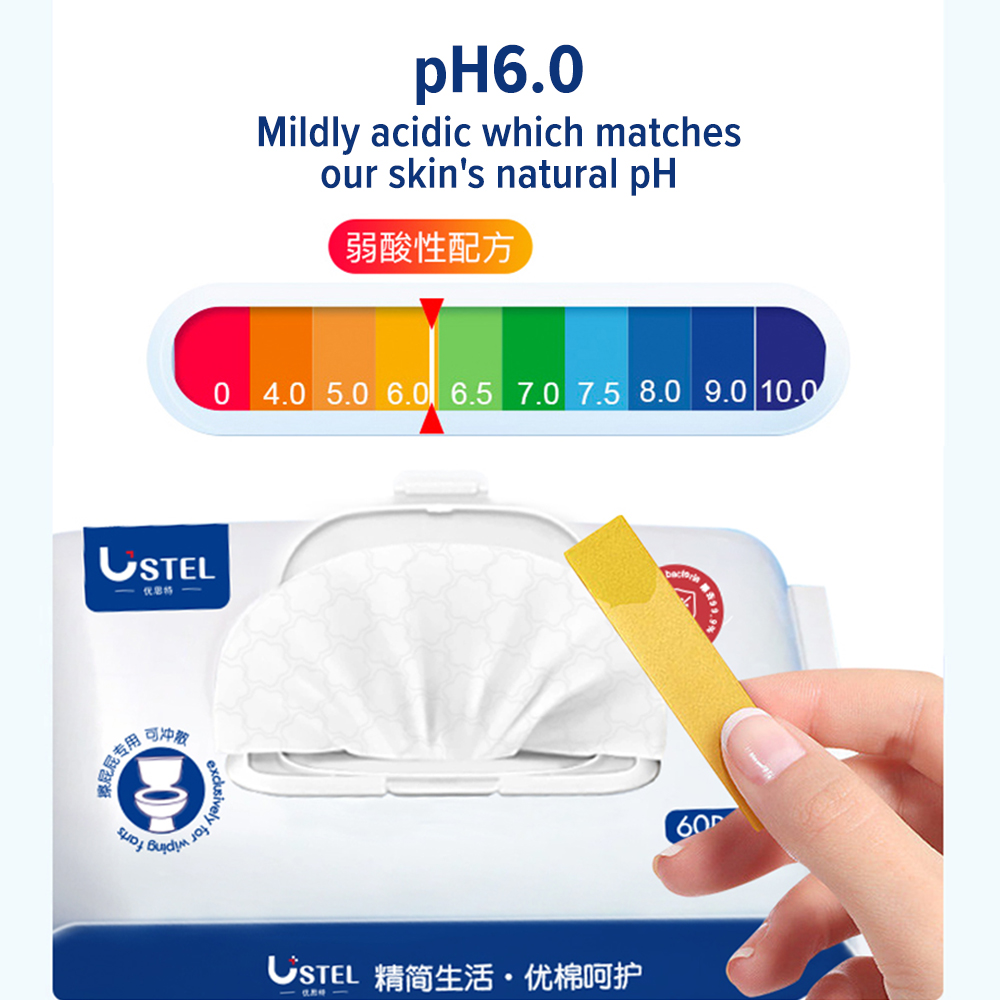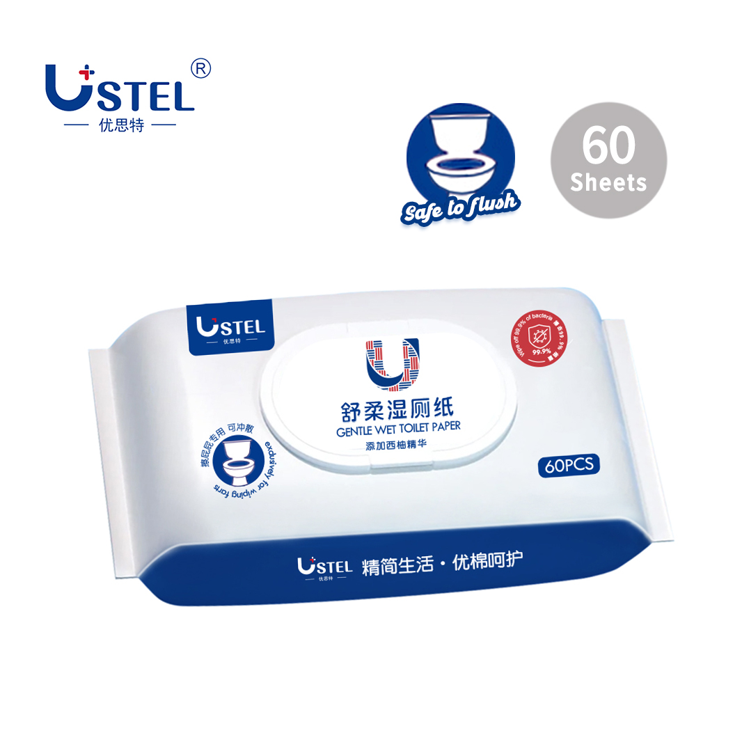 Moistened by 12 step purified water, the Ustel flushable wipes uses a pure water formula with flushable wood pulp non-woven fabric, with exquisite embossing design to effectively cleans poo and dirt and wipes off 99.9% bacteria.